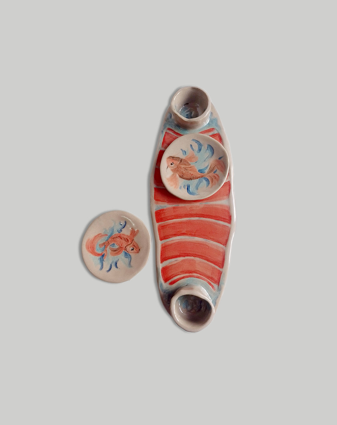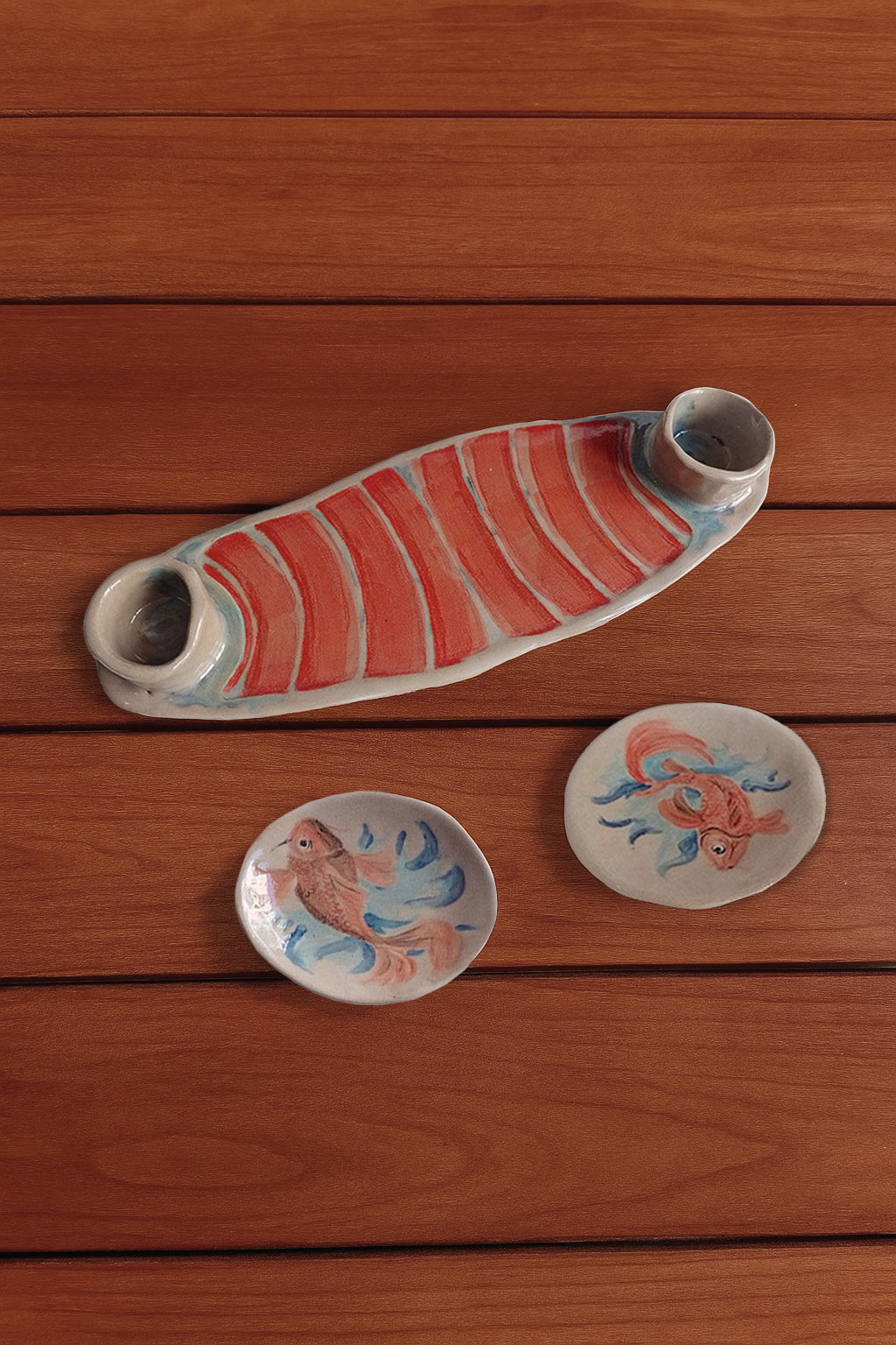 - Una bandeja cerámica de 39 x 15 cm. con dos cuencos adheridos de 4,5 cm de alto para poder colocar allí tus salsas, tus frutos secos, tus aceitunas, etc.